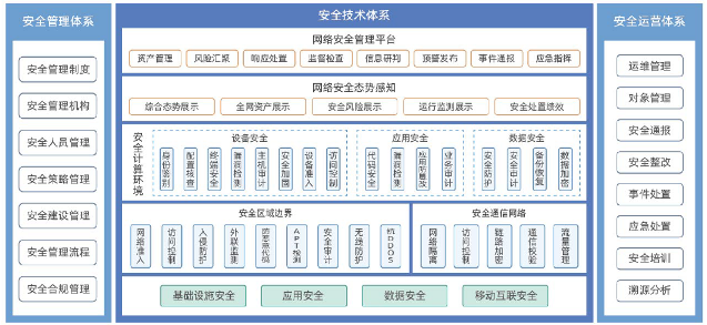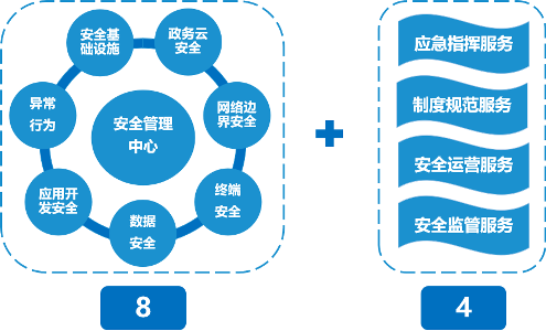 “8”指從安全基礎設施、政務(wù)云安全、網(wǎng)絡(luò )與邊界安全、政務(wù)終端安全、數據安全、應用開(kāi)發(fā)安全、異常行為感知、安全管理中心八大方面提供技術(shù)能力落地。其中,安全管理中心是通過(guò)信息化手段支撐實(shí)現應急指揮服務(wù)、制度規范服務(wù)、安全運營(yíng)服務(wù)、安全監管服務(wù)工作落地。