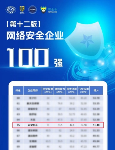 近日,由中國計算機學(xué)會(huì )(CCF)抗惡劣環(huán)境計算機專(zhuān)委會(huì )、中關(guān)村華安關(guān)鍵信息基礎設施安全保護聯(lián)盟、信息產(chǎn)業(yè)信息安全測評中心、安全牛聯(lián)合發(fā)起的第十二版《網(wǎng)絡(luò )安全企業(yè)100強》榜單正式發(fā)布,遠望信息再度上榜網(wǎng)絡(luò )安全企業(yè)100強,充分體現了企業(yè)在網(wǎng)絡(luò )安全領(lǐng)域的綜合實(shí)力及領(lǐng)先地位。