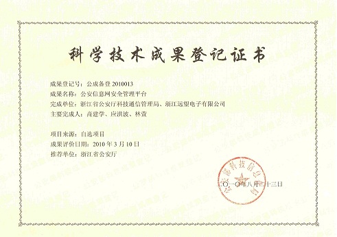 2010年,浙江遠望電子有限公司的公安信息網(wǎng)安全管理平臺獲得公安部科技成果登記證書(shū),遠望公司成為公安部《公安綜合信息安全管理平臺技術(shù)規范》主要起草單位。